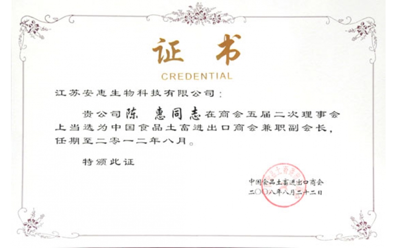 2008年8月22日,陳惠董事長在中國食品土畜進出口商會五屆二次理事會上當選兼職副會長。